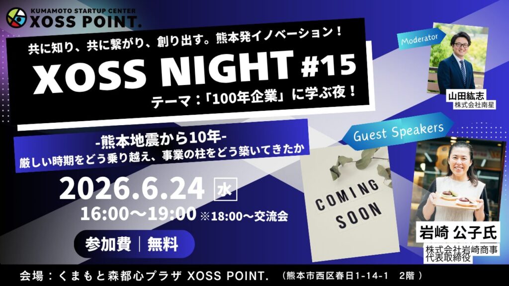 クロスポイント熊本で開催される「XOSSNIGHT」。熊本のスタートアップ企業や研究シーズ、イノベーションの最前線を知る場として、地域の企業関係者や金融機関、VCなど幅広い方々に、共創のきっかけを提供する場です。その15回目として、100年企業経営者を招いてのイベントを開催します!